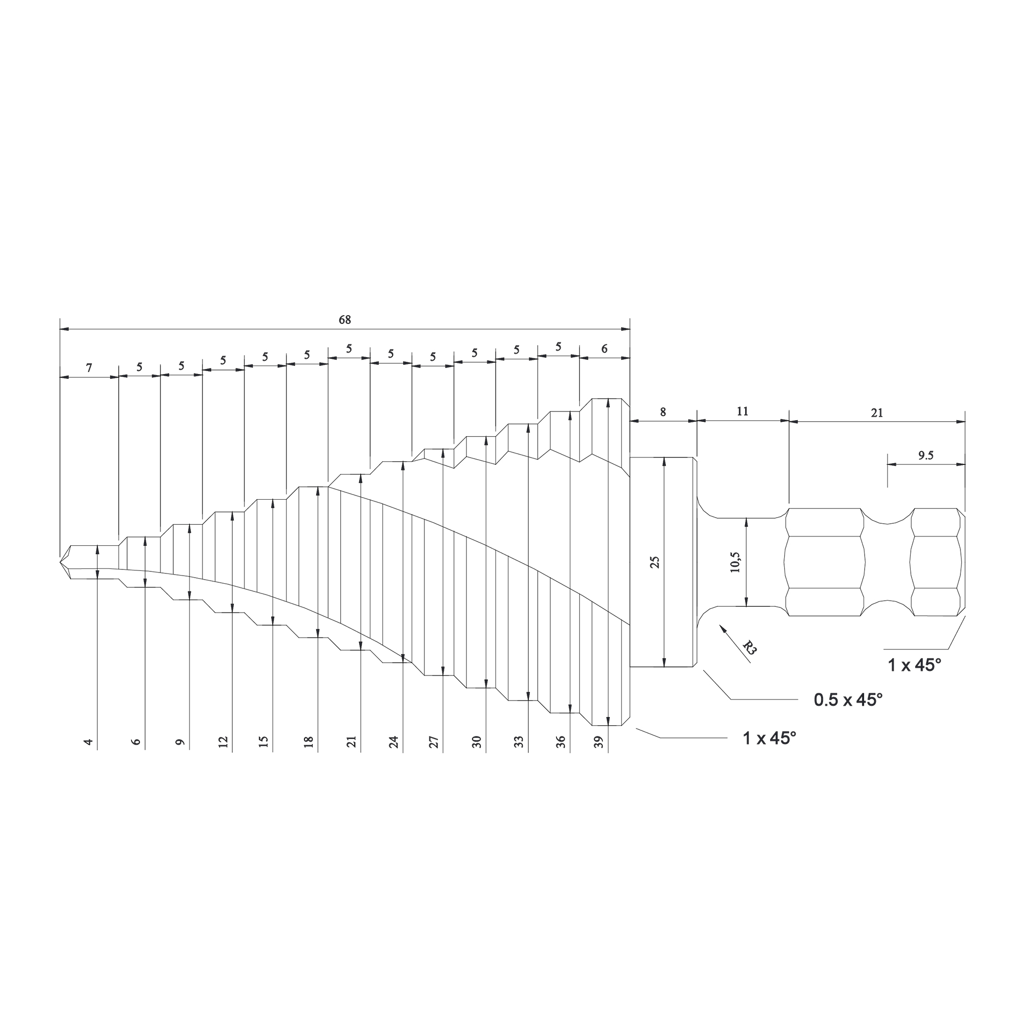 Dimensiune – 4 – 39 mm / 13 trepte (4, 6, 9, 12, 15, 18, 21, 24, 27, 30, 33, 36, 39)