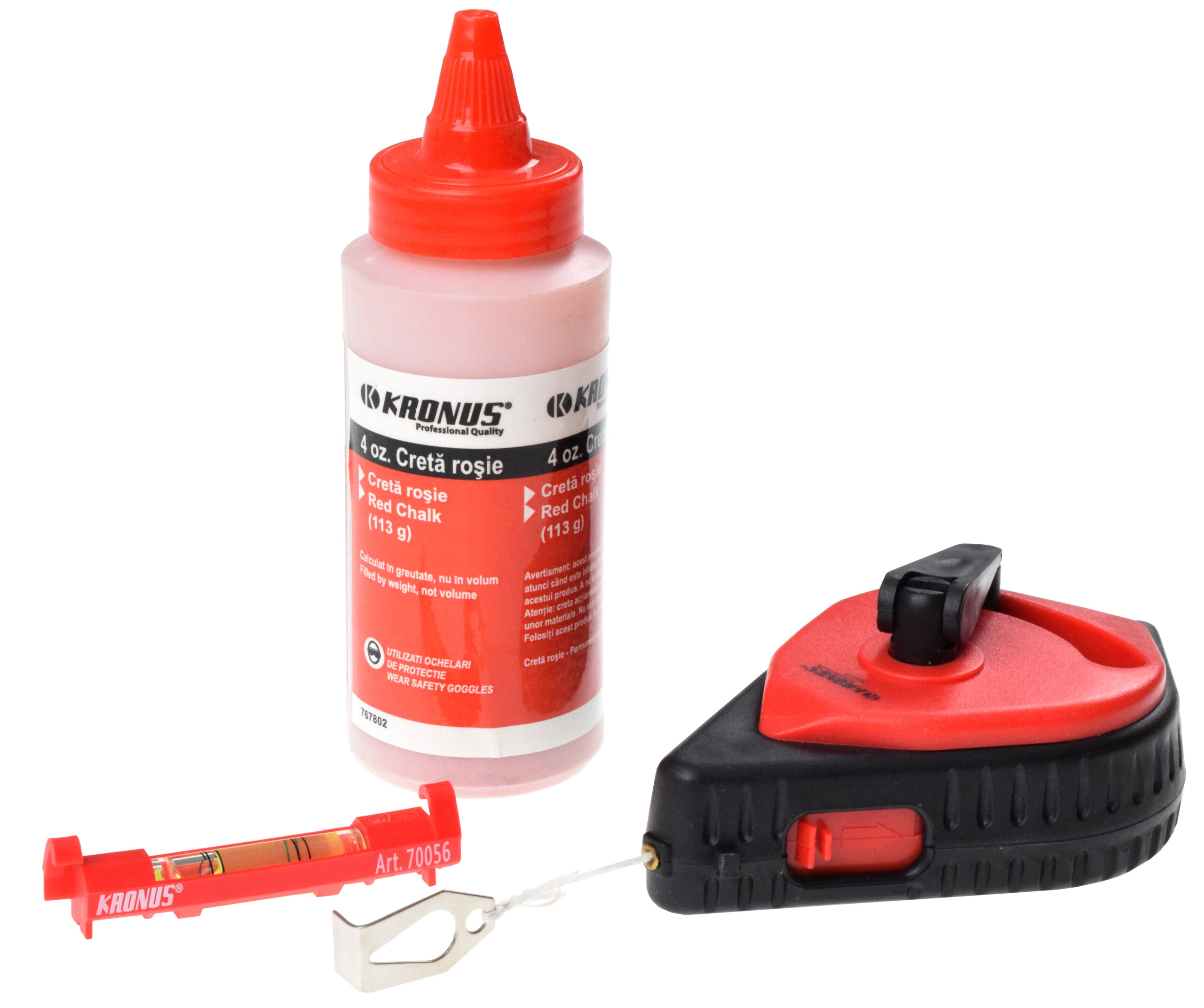 – Include trasator 30 m cu creta albastra 113 g si mininivela 75 mm